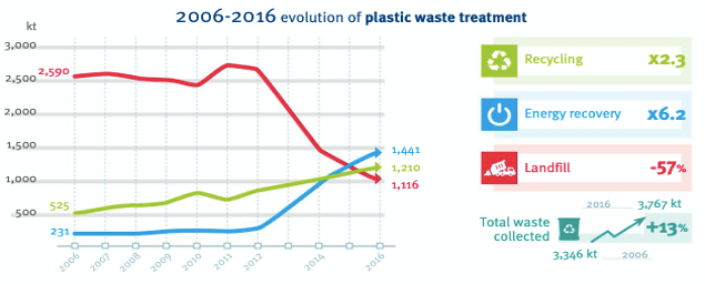 Le rapport annuel de PlasticEurope (2018), montre l’évolution des différents moyens de traitements des déchets plastiques post- consommation en France, ci-contre, sur la période 2006 – 2016. En doublant ses capacités de recyclage sur la période, la France n’est pas parvenue à recycler autant de déchets plastiques que de tonnes enfouies, malgré une réduction de presque 25% du tonnage enfouis sur la même période.