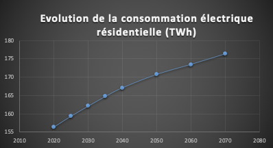 Sur le graphique ci-dessus, nous pouvons observer la consommation électrique résidentielle moyenne de 2019, pondérée par les prévisions de la croissance démographique de la France, ce qui donne l’évolution possible de la consommation électrique française selon le temps.