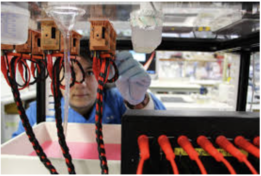 Bristol Bioenergy Centre, (2015). Microbial fuel cells [image digitale]. [Vu le 11/05/2020]. Disponible sur : https://commons.wikimedia.org/wiki/File:Checking_the_connections_of_Microbial_Fuel_Cells_on_EvoBot.JPG