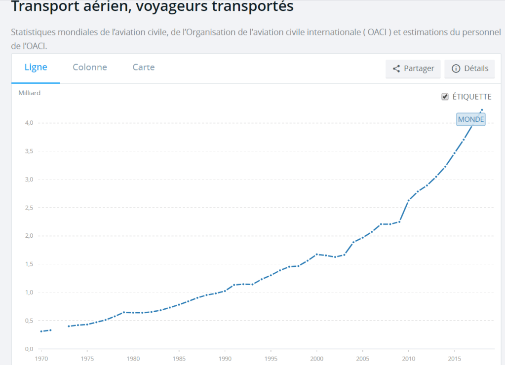 Le premier témoin de l’explosion des échanges dans le monde est le trafic aérien mondial puisque ce type de transport n’est sans doute pas le transport le moins polluant. Depuis la fin de la seconde guerre mondiale, celui lui-ci n’a cessé de s’envoler et selon les estimations cette hausse n’est pas prête de s’arrêter. Le nombre de voyageurs en 1960 était de 108 millions, alors qu’en 2018 , 4,3 milliards de passagers ont été transportés par avion selon l’Organisation de l’aviation civile internationale (OACI).
