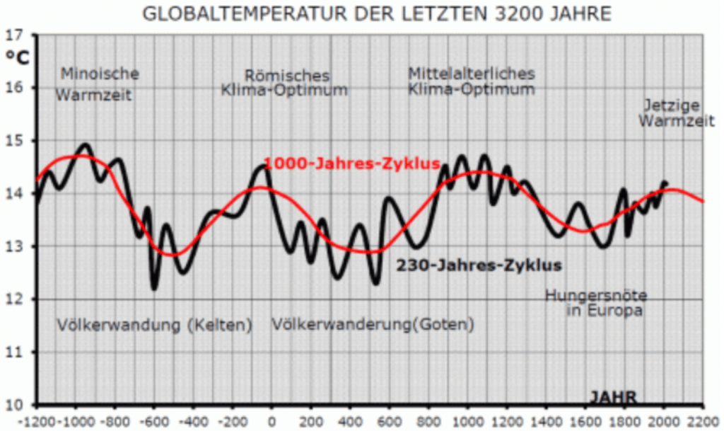 Plus exactement, les variations sont des cycles incluants de nombreux autres cycles, prenons par exemple les cycles de 230 et 1000 ans selon « Klima-Zyklen und ihre Extrapolation in die Zukunft » :