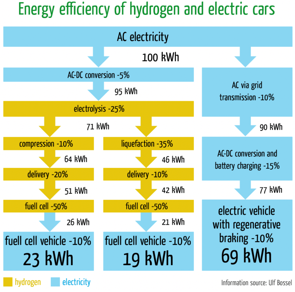 Le rendement énergétique d’un moteur à hydrogène, peu importe la manière de le compresser, est plus de 3 fois inférieur à celui du moteur électrique.