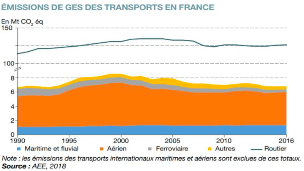 Tout d’abord, les émissions de GES sont majoritairement issues du transport routier. Cela se constate en Europe avec environ 900 MT CO2 équivalent émis en 2016, mais aussi en France avec 125 MT de CO2 émis en 2016 pour un total de 94,9 % des émissions de gaz à effet de serre liées aux transports.
