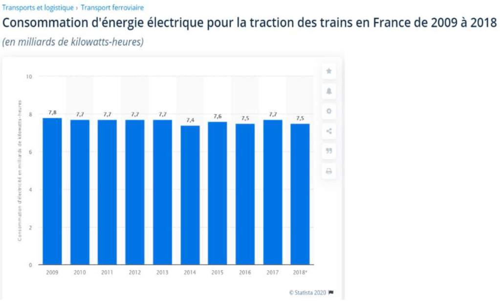 Consommation d’énergie électrique pour la traction des trains en France de 2009 à 2018, Statista 2020. https://fr.statista.com/statistiques/525707/consommation-energie-electrique-trains-france/