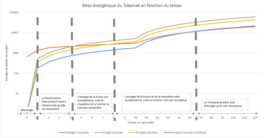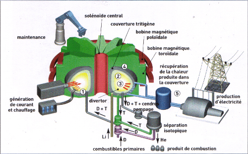 Le but de la fusion est de produire de l’électricité. Ainsi le système réacteur, chaudière, turbine doit produire plus d’électricité qu’il n’en consomme. Un tel système a un rendement dépassant rarement les 35%15.