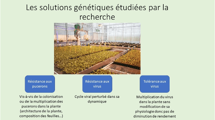 Il serait donc préférable de trouver une solution qui ne soit pas un substitut chimique mais une solution à long terme. Au début des années 2000 des recherches pour des betteraves résistantes à la jaunisse ont été entreprises, notamment au Royaume-Uni, mais elles ont été freinées par le développement des insecticides néonicotinoïdes. Aujourd’hui, même si ces insecticides sont interdits ou en voie de l’être, la recherche a repris. Pour la betterave, des projets comme le projet Aker ou l’entreprise SESVanderHave font de la sélection génétique afin de développer des variétés de betteraves résistantes à la jaunisse. Ils travaillent selon plusieurs axes de résistances, la résistance aux pucerons, la résistance aux virus ou bien la tolérance aux virus.