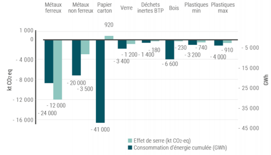 On observe l’impact remarquable du recyclage sur la consommation d’énergie cumulée en France en 2014, surtout en ce qui concerne le recyclage des métaux et du papier et carton.