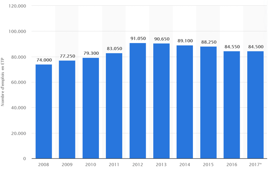 Source : Statista. « Emplois liés aux déchets France 2008-2017 ». Consulté le 13 février 2021. https://fr.statista.com/statistiques/576793/nombre-emplois-secteur-dechets-france/